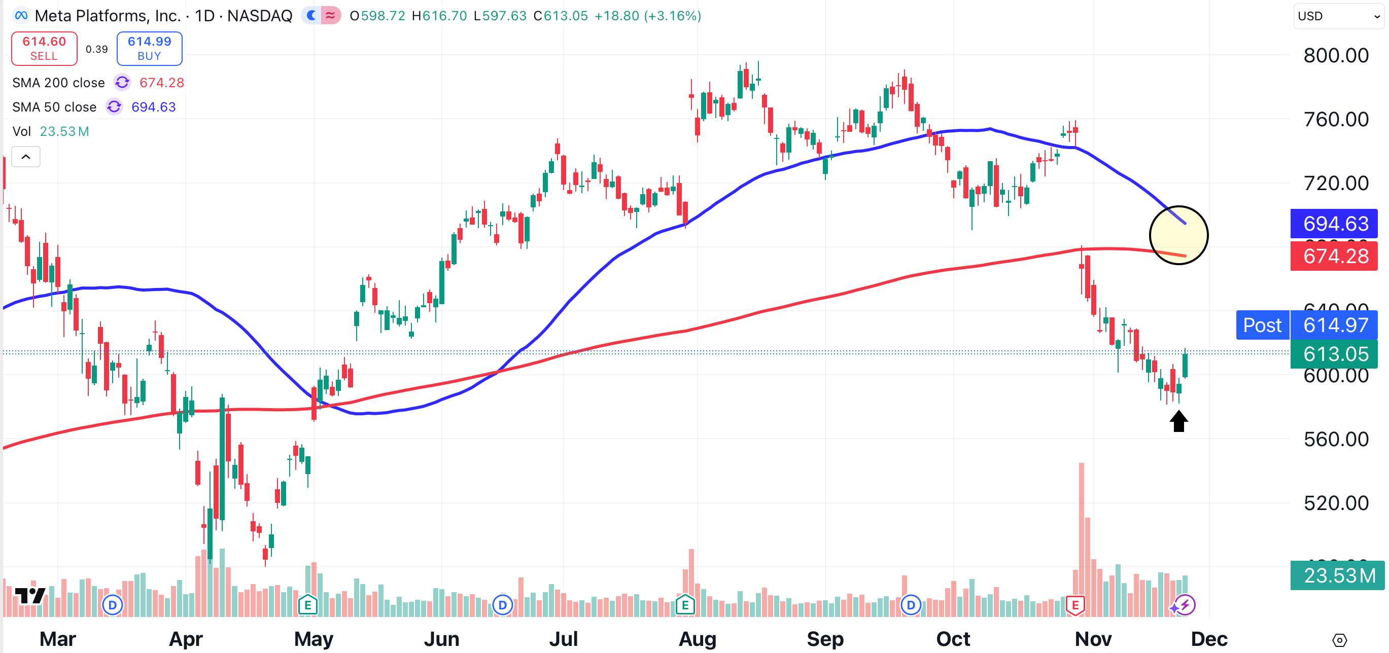 Meta Platforms (META) has finally found support (up arrow) in the $585 area. The parent company of Facebook, Instagram, and WhatsApp is trading well below its 50-day (blue) and 200-day moving averages, which appear headed for a bearish crossover (circled).