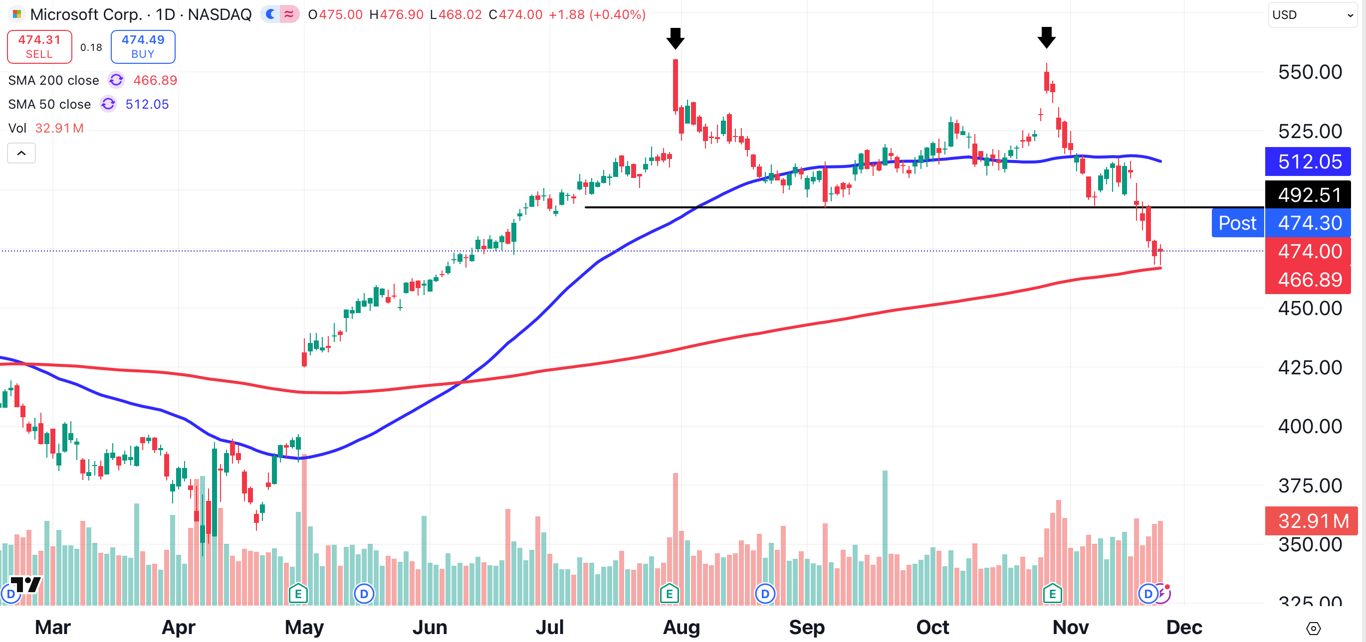 Microsoft (MSFT) continues to slide after forming a double top (arrows). The software giant is now testing its 200-day moving average (red). Microsoft failed to gain traction during the Friday-Monday stock rally.