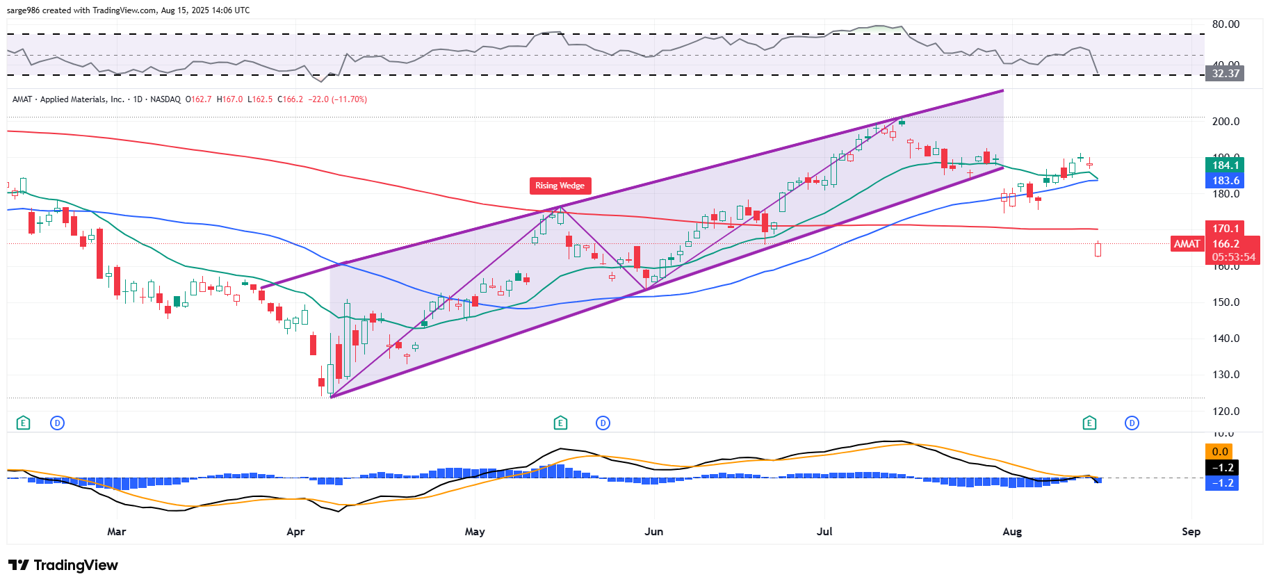Readers will see that AMAT broke down from a rising-wedge pattern of bearish reversal in late July. I guess that was the hint that many apparently missed. ​Now, two weeks later, in response to weak guidance and a less than enthusiastic C-suite, the stock has surrendered its 50-day and 200-day SMAs in one fell swoop.