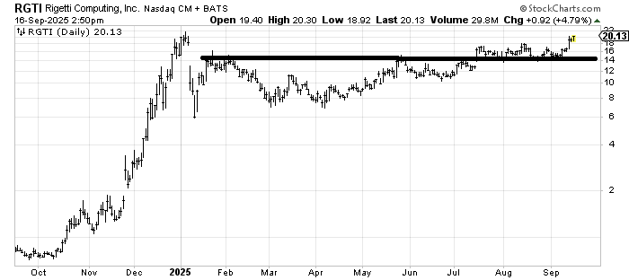 Rigetti Computing RGTI, a stock I recommended months ago, is finally reaching the old high, which was my original target area (21-22). But it hasn’t done anything wrong yet. If you wanted to take some profits here, I wouldn’t argue, though.