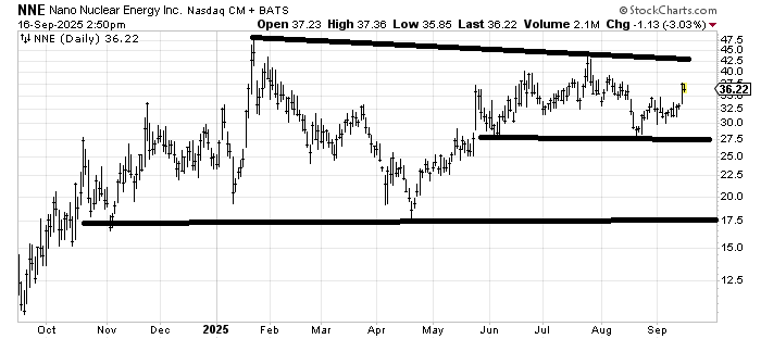 Nano Nuclear Energy (NNE) is in the middle of nowhere. It can’t seem to get to the July high, but can’t break 27 either. I’d get concerned if it can’t get over 40 in the next week.