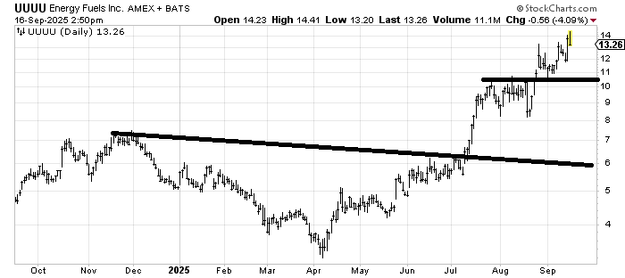 Energy Fuels (UUUU) looks a bit tired up here, but that’s the worst I can say right now. It has no pattern left, though, so it could use some sideways action.