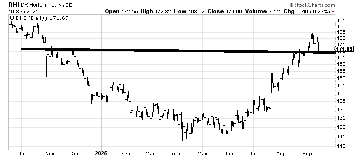 Last week, I said DR Horton DHI was still okay, but I’d like to see it come down to 170 to see what’s down there. It has come down and is trying to hold. If it breaks it, I’d fret over that. It’s the first correction after a huge run. If the stock is any good, it should get bought fast, so if it doesn’t, there’s probably a bigger correction in store.