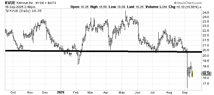 Kenvue (KVUE) is not a pretty chart, having just broken down from a decent-sized top. The pattern measures to 16-ish, but my view that spike lows tend to hold on the first trip down means that I would expect if the stock has a visit into that area in the next few weeks, I’d look for a bounce. But also keep in mind the time of the year. I would expect tax loss selling to show up into year-end. For now, I would treat it as a trade.