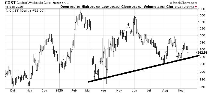I want to follow up on Costco COST because it rallied last week, but it made a lower high and looks as if it wants to test that uptrend line again. A break of that 920-940 area would be bearish.
