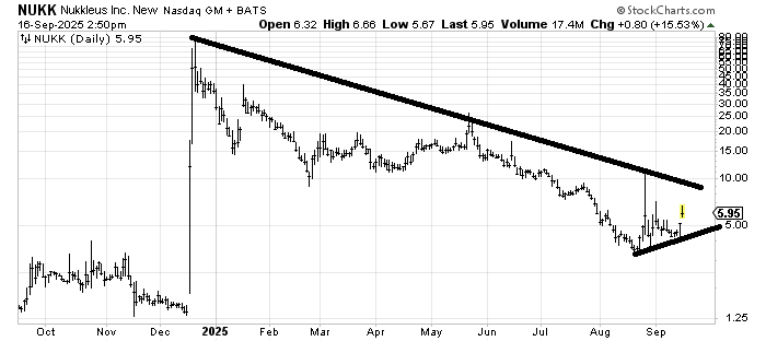 The chart of Nukkleus (NUKK) is exactly the type of chart I tend to get sucked into; makes a low, rallies, and comes back down to make an equal or higher low (a W), so I guess as long as it doesn’t break under that lower line, we give it a chance. But it trades very spiky, and 10 is serious resistance.