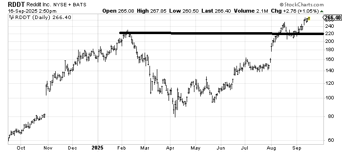 Reddit RDDT hasn’t done anything wrong yet. In fact, it broke out and tested the breakout. I can’t chase a stock up like this, but it’s a hold. If it breaks back under 220 (far away) I’d be concerned. A pullback to 240-250 is more likely.