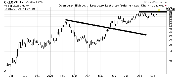 Oklo (OKLO) has a next measured target around 100. The recent sideways pattern measures to that area, and there is the 90/100 rule, which says 90% of the stocks that make it to 90 will make it to 100.