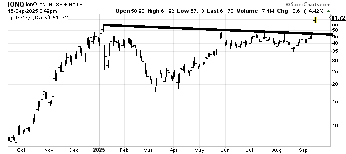 IonQ IONQ is stretched, but it just broke out. There is a longer-term measured target around 75, but it is vulnerable to a pullback given how stretched it is up here.