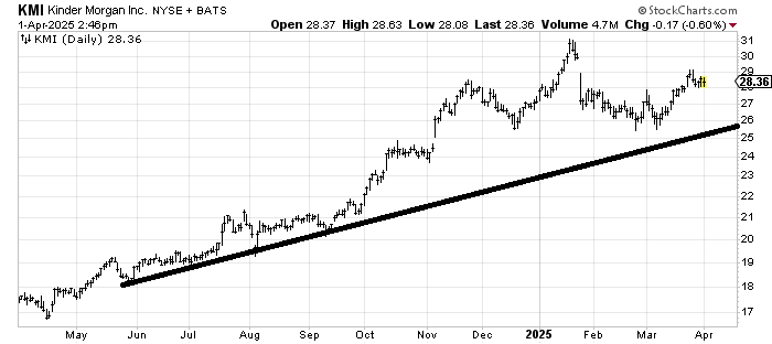 Kinder Morgan KMI is still hanging in there and hasn’t broken anything yet. As long as it holds this 28-ish area the next upside target would be filling that gap around 30. Notice that sometime later this month, the uptrend line will be around 26, so a break of 26 and that would be enough to complete a top in the chart. For now, it looks sideways.