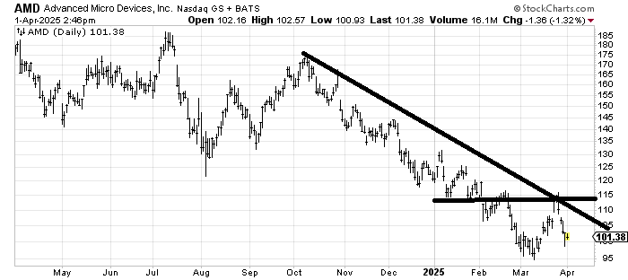 Advanced Micro Devices AMD still can’t make a higher high. Sure it ought to rally again but unless/until it makes a higher high or starts basing, t here isn’t much to do aside from trade it. It should get oversold again within the next few days, in this 95-100 area, enough for another bounce.
