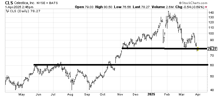 Celestica CLS is hanging by a thread, but it is oversold. It also looks like a big top that hasn’t broken yet. If the stock can’t rally in the next few days/week I think the next target is down near 60.