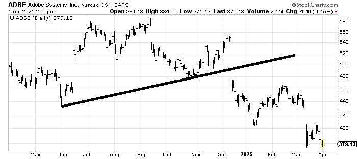 Adobe ADBE might be oversold down here but the big picture is that it has had three gaps down since August. Why bottom fish in this market? There is a longer-term measured target of around 300. If the stock can rally to fill that gap around 435, I’d be a seller.