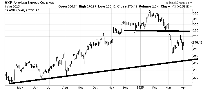 I was asked a few weeks ago about American Express AXP, and I thought it would rally to the 290 area where I would sell it. It only made it to 280-ish, but now it has come down to a higher low, so I still look for a move toward 280-290.