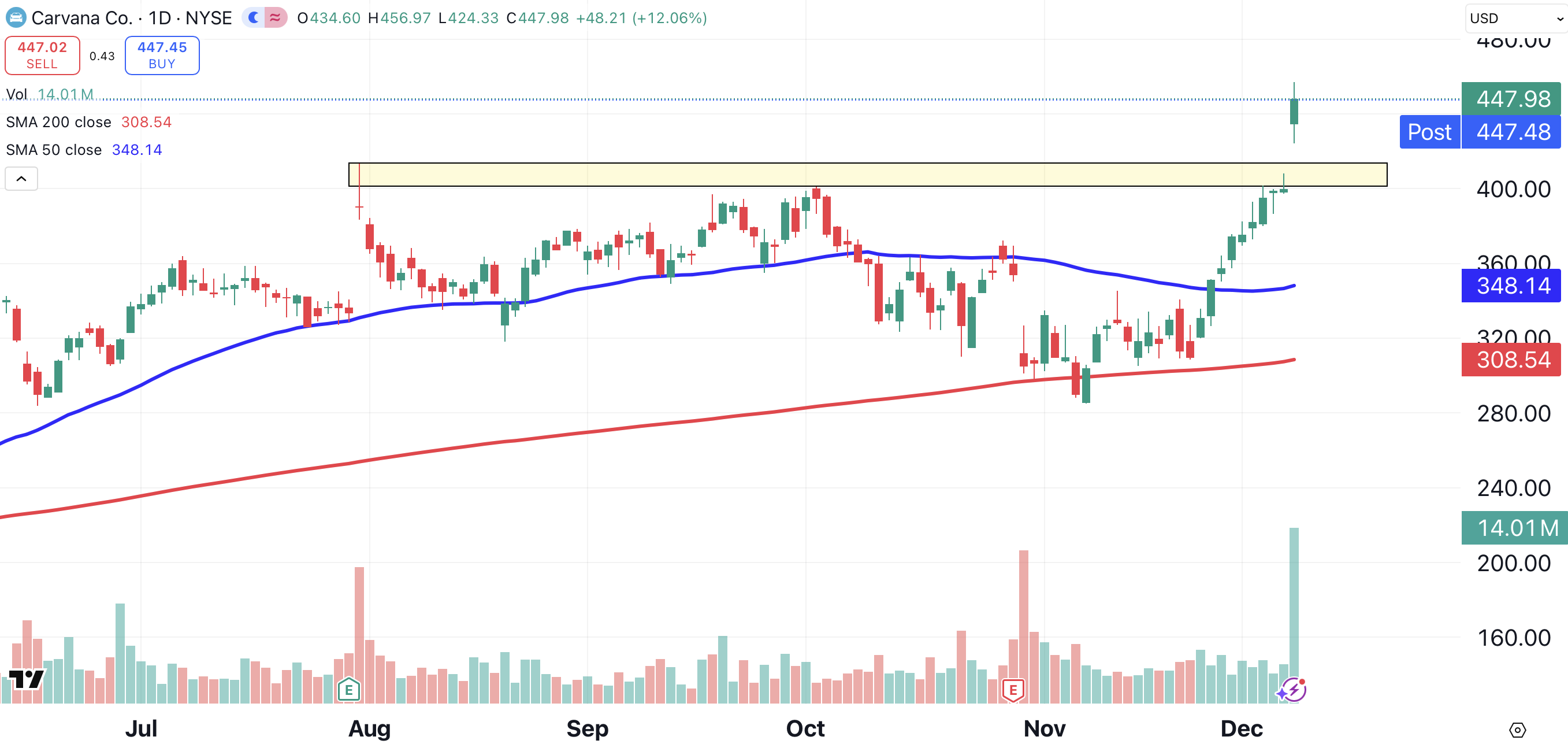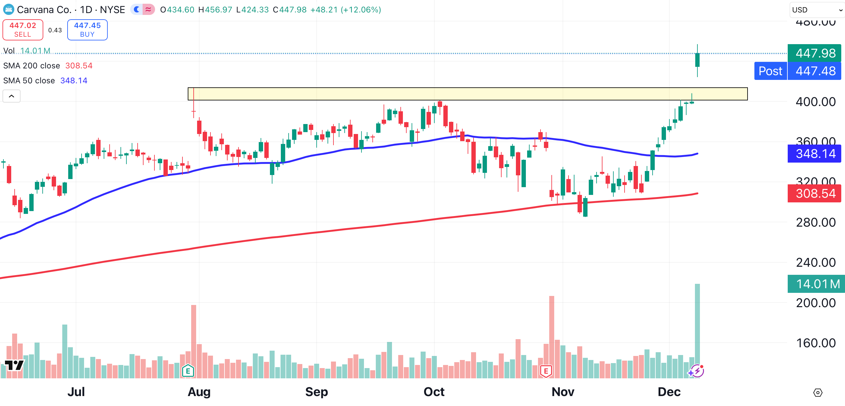 Carvana (CVNA) shares jumped 12% on Monday to reach an all-time closing high of $447. The move came days after it was revealed the online automotive sales platform will become a component of the S&P 500 on Dec. 22.
