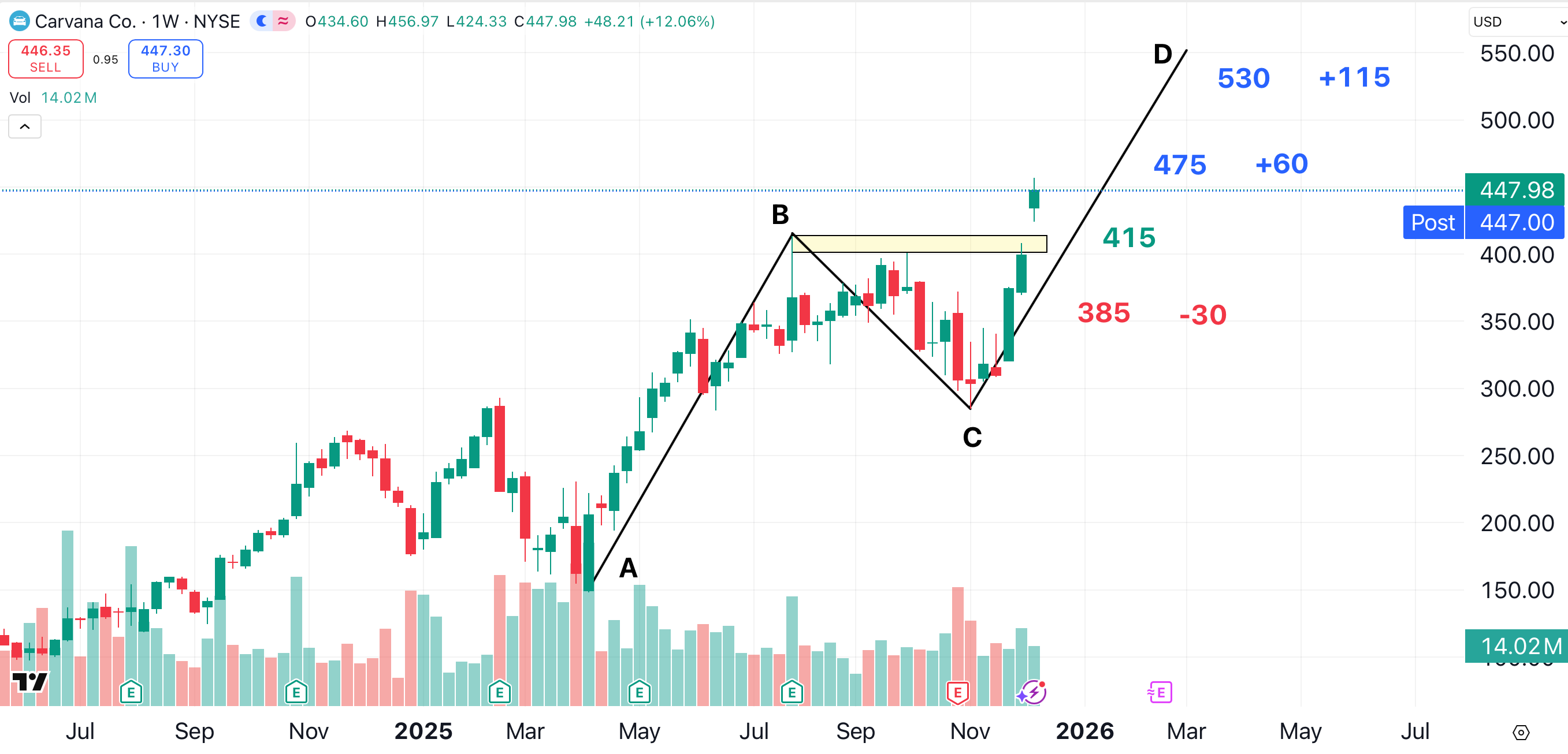 Carvana has formed an A-B-C-D pattern (black lines). That bullish pattern projects Carvana to the $530 area, which is our new price target for the stock.