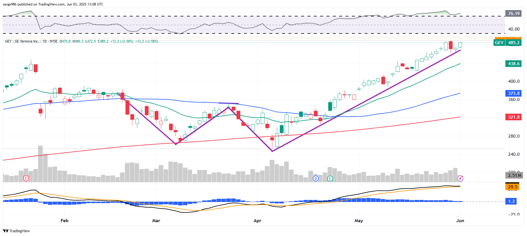 The only problem there is that GEV exploded out of a double-bottom pattern of bullish reversal in early April and never looked back. To initiate or add, one might want to wait for a test of at least the 21-day exponential moving average. In fact, someone long the shares might use this morning's strength to make a sale and then try to repurchase when that swoon does appear.