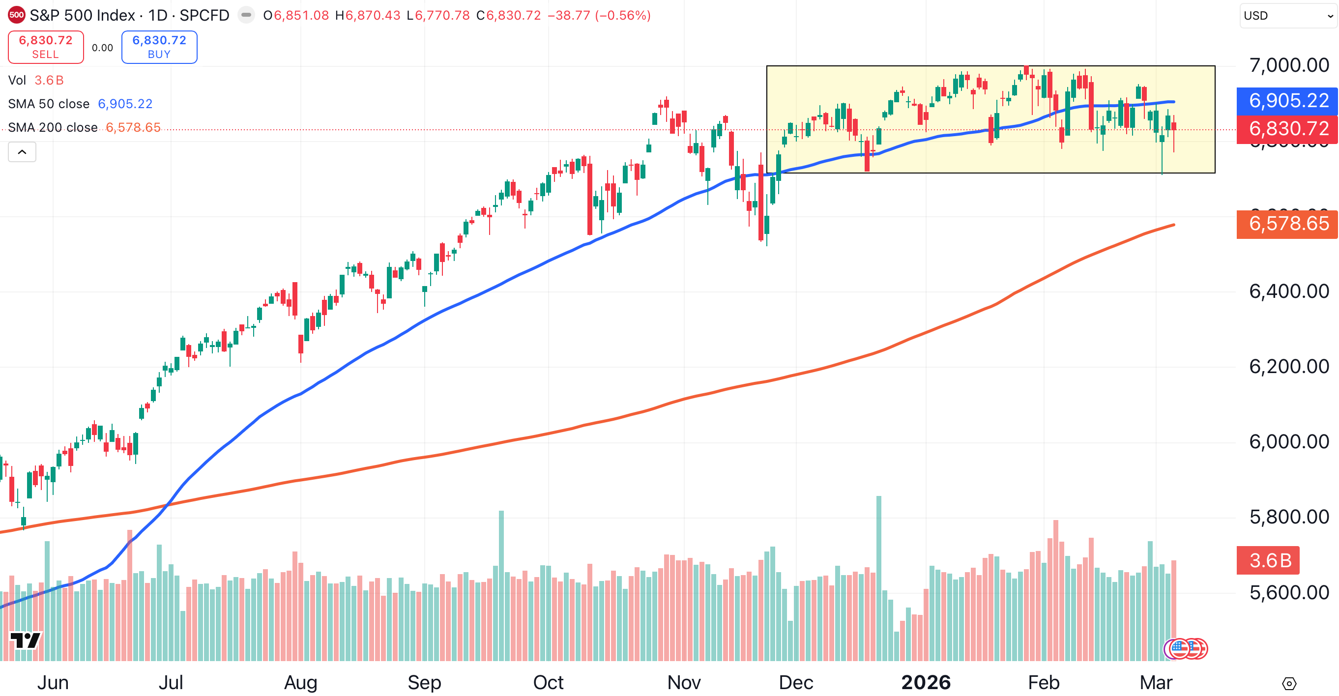 For the S&P 500, that 300-point range extends from approximately 6,700 to 7,000. We’ve been stuck in that range since Thanksgiving (shaded yellow).