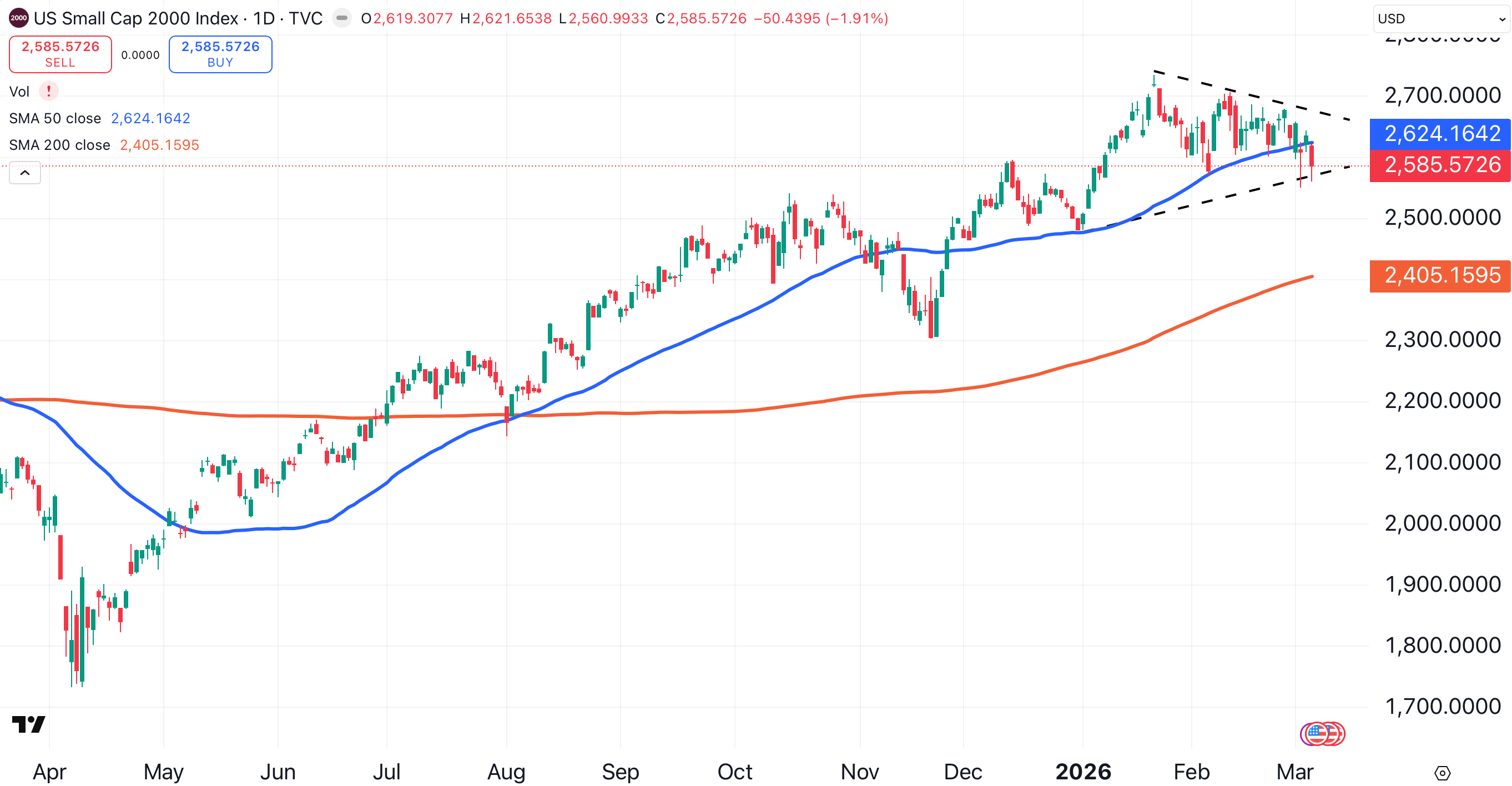 A shorter, tighter consolidation is visible in the Russell 2000, The small-cap index has formed a symmetrical triangle pattern (black dotted lines).