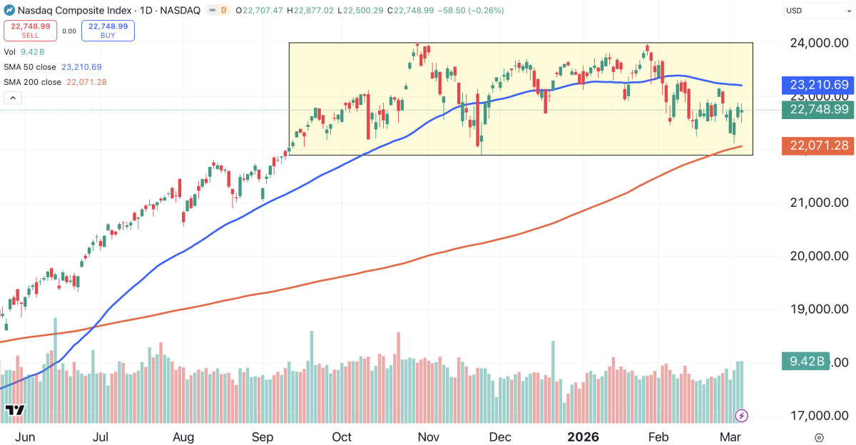 The tech-heavy Nasdaq Composite index has been trapped in a range between approximately 21,900 and 24,000 since Labor Day 2025 (shaded yellow).