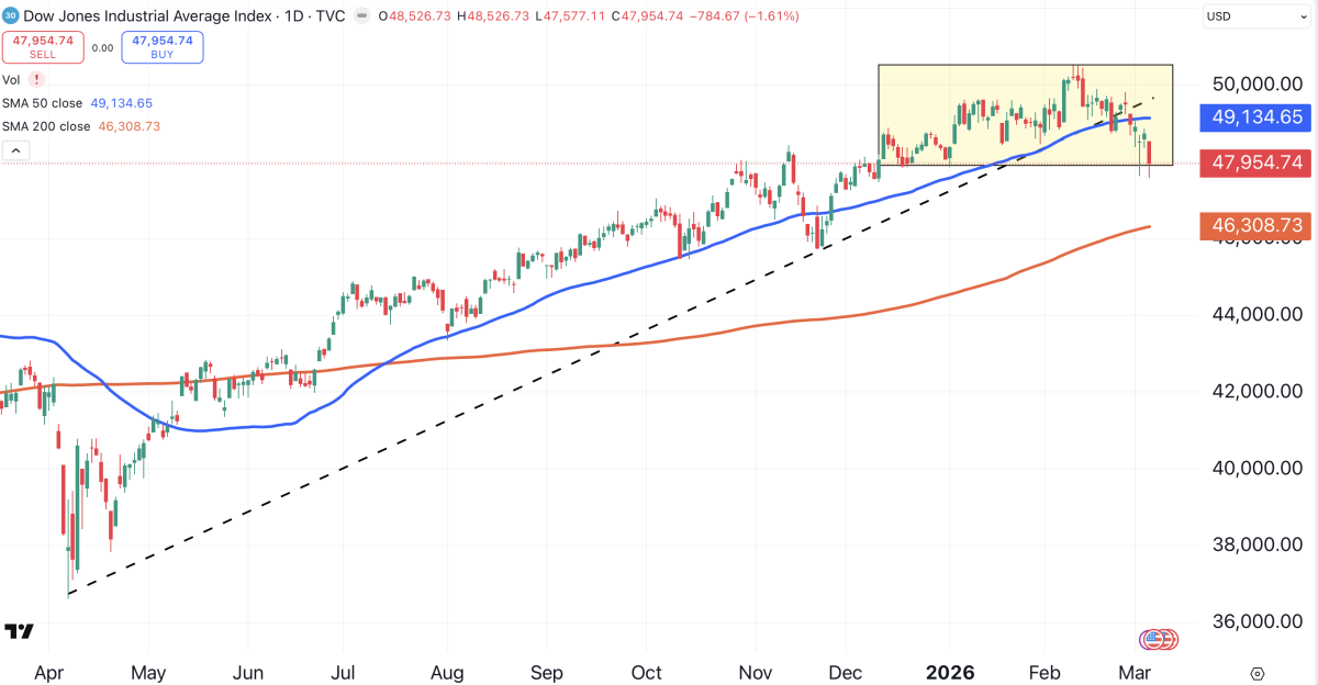 While the Russell currently has the best chart of the major indexes, the Dow Jones Industrial Average may have the worst.