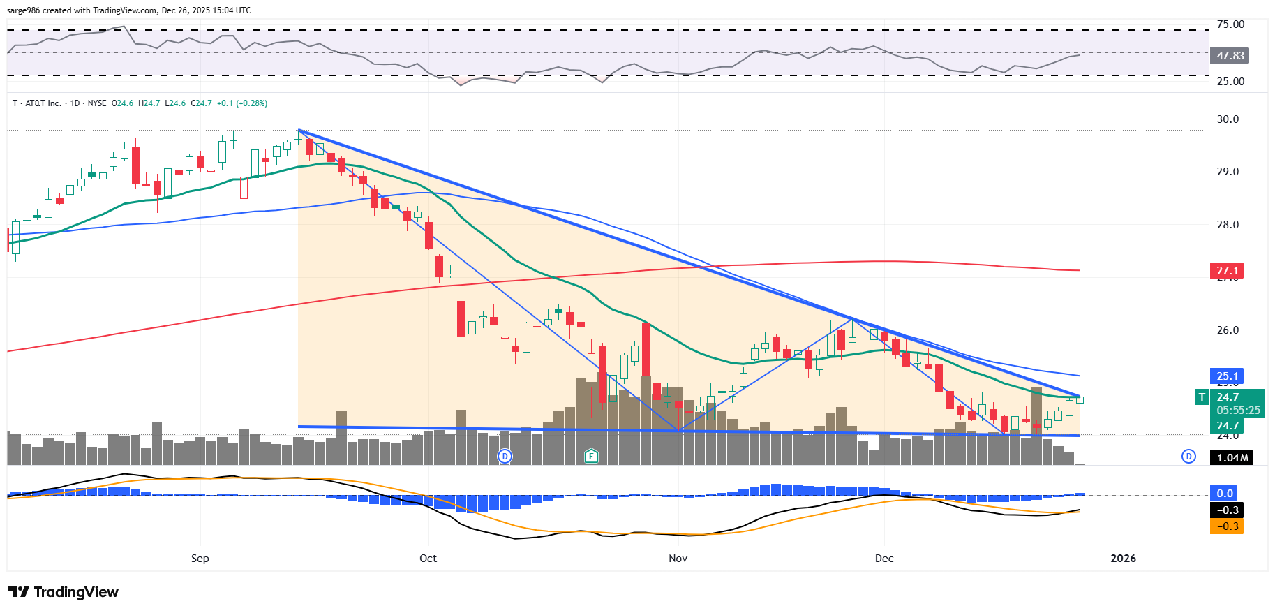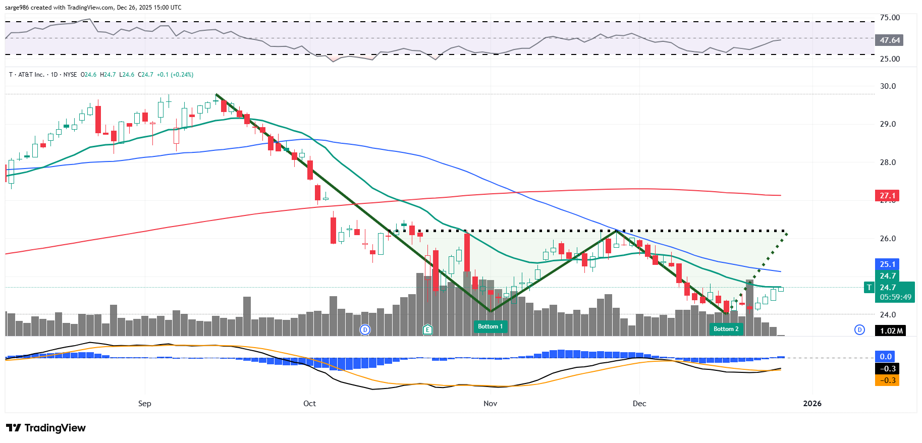 Nobody needs to do anything until the chart decides which one of these patterns will remain on the chart after the stock moves past one of those two pivots. I would rather get bullish above $26 or bearish below $24 than "take a shot" in between those two levels. AT&T is not going so far so quickly that an investor cannot show patience in the face of a chart that tells two tales.