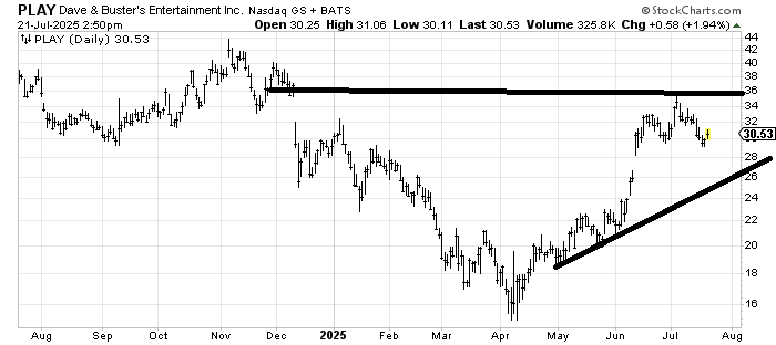 Dave & Buster’s PLAY filled the gap from December and is now spending its time correcting. If it can go sideways for the next month or so, eventually tagging that uptrend line that might get me interested again. I figure the uptrend line should come in around 28-ish a month from now.