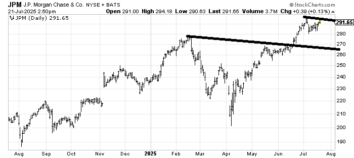 JP Morgan JPM hasn’t done great since earnings were announced, but it hasn’t fallen apart either. A correction into that 270-280 area would help the chart.