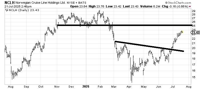 I was asked to follow up on Norwegian Cruise Line NCLH, which I liked a few months ago. It’s a bit over-extended in the near term but the target is around 25.