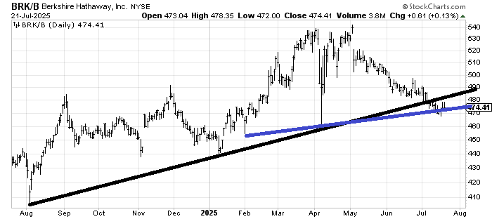 A few weeks ago, I thought Berkshire Hathaway BRK.B should rally from this area (480-ish). It did not hold and broke the line. Yet I still thought it should recapture the black line. Thus far, it cannot, but I cannot shake my view that it should rally.