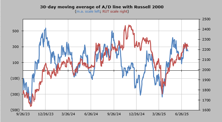 The 30-day moving average of the advance/decline line is overbought.