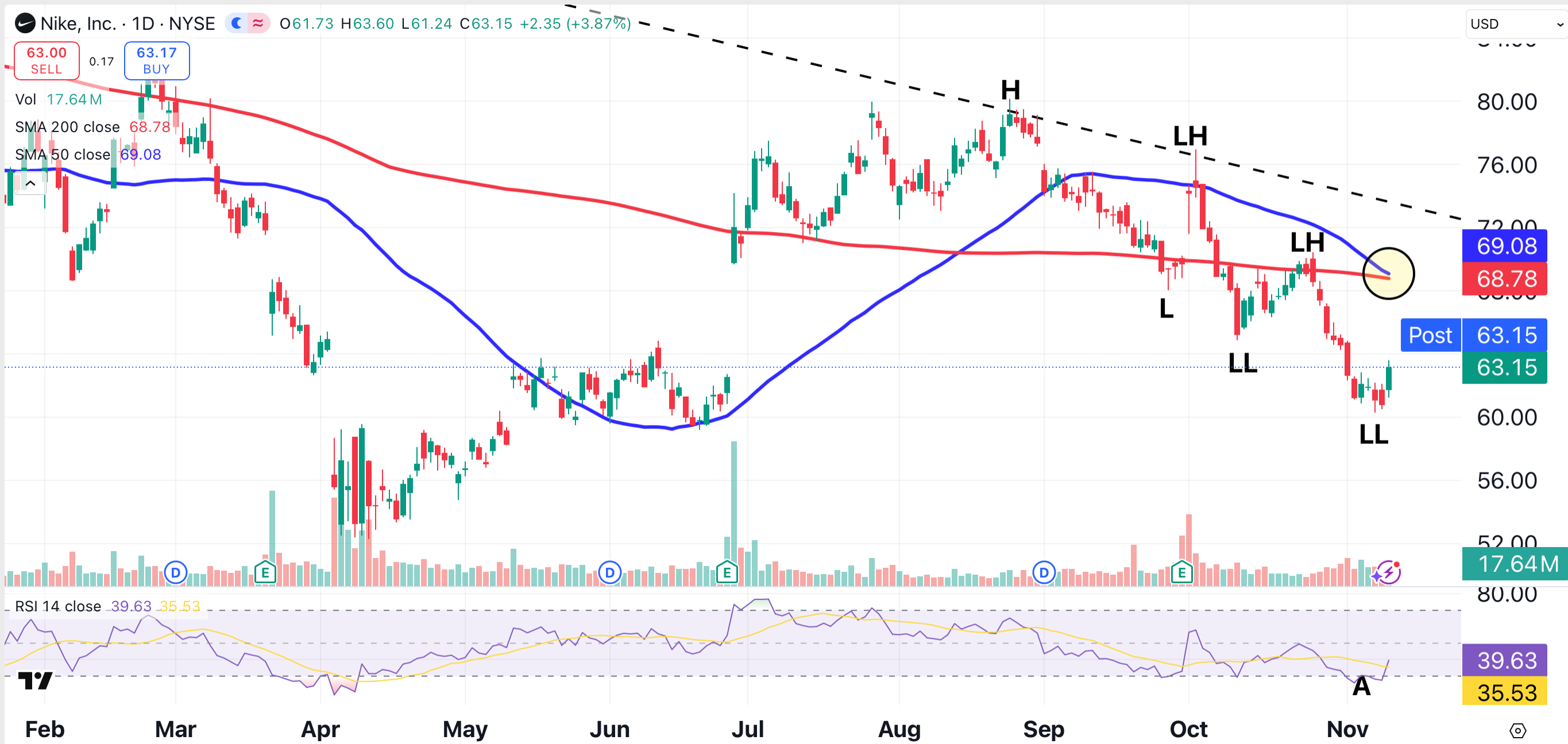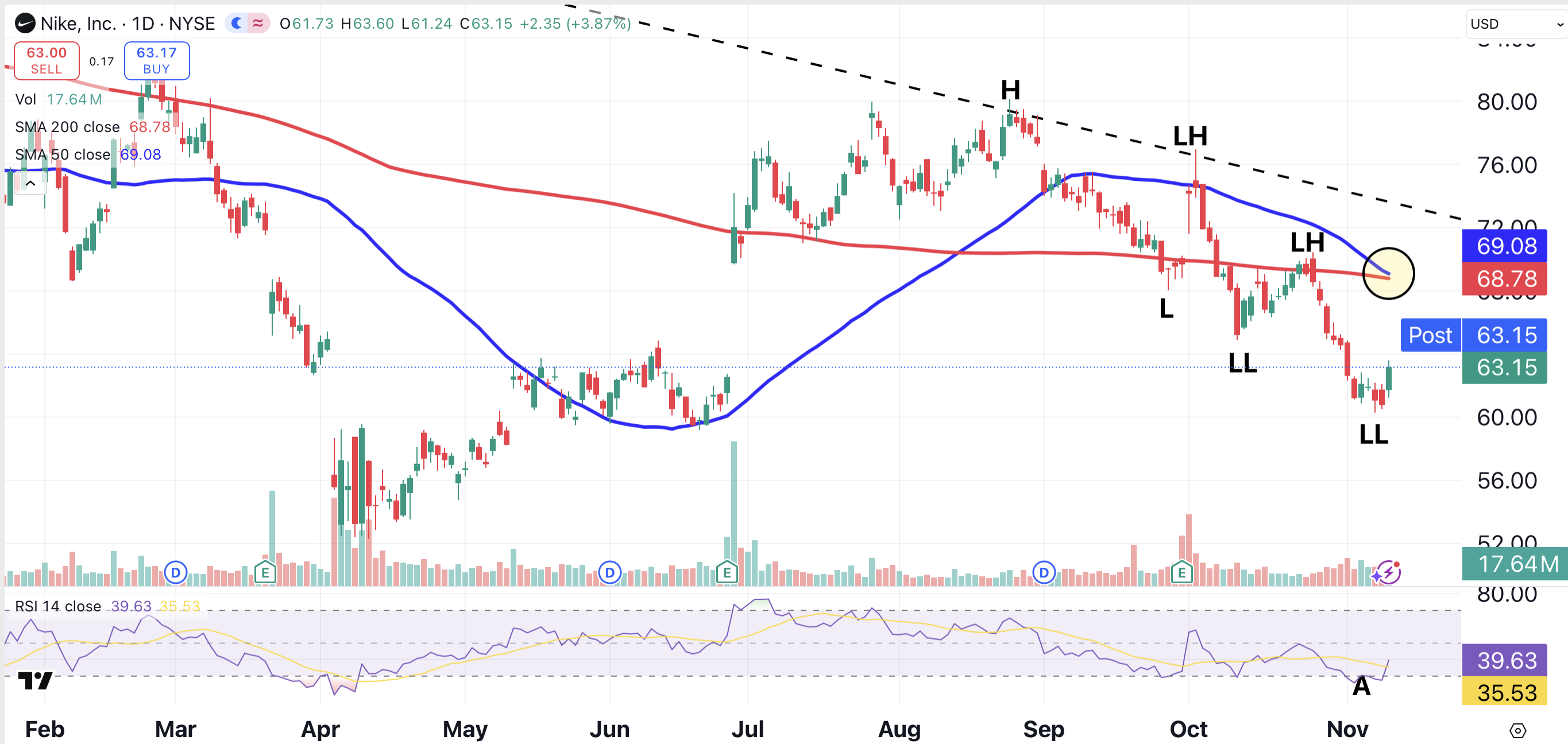 Nike’s bounce on Tuesday originated from an oversold condition (point A), according to the stock’s relative strength index (RSI). Despite the bounce, Nike remains in an overall bearish trend.