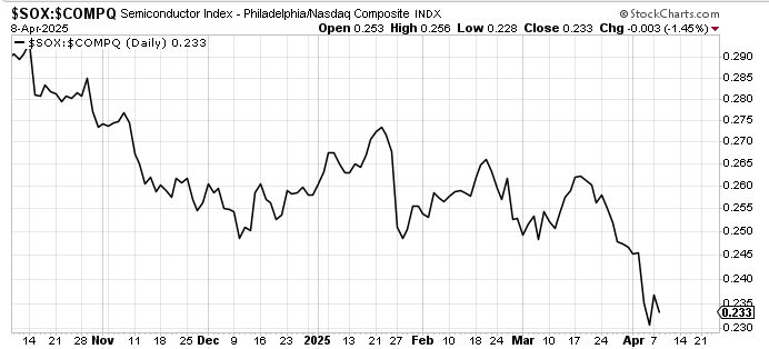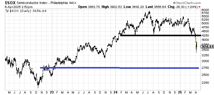 The question is what the downside target would be for the SOX, the Semiconductor Index. The sideways move it broke down from in early March measured to 3300, which is where it bounced from. It ought to bounce up toward 4000-ish now. A break of that 3300 area would then measure into the 2750 area but there are layers of support all the way down.