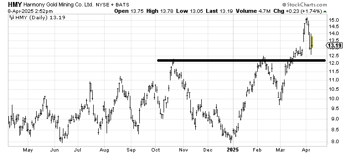 Harmony Gold HMY measures to 16-ish. So, my question is if that move just over 15 was enough. I’d give it some leeway, but if it breaks under 12, I would not hang around.