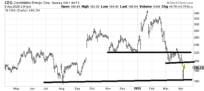 Constellation Energy CEG broke down but tagged support. That top it broke down from measures to around 100. I don’t know if it will get there, but I can tell you that if the stock gets into that 200-220 area, I’d be happy to sell some there. A break of 160-ish would, in fact, put that 100 target in play over a longer-term basis.