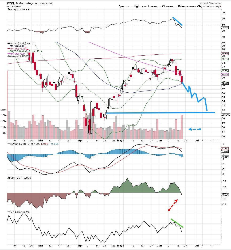 After a nice rally in the Spring we see PayPal PYPL is back to its old bearish ways. The stock could not even get above the 200-day moving average recently before heading lower, and that means a new downtrend is likely in place. The latest move down is on heavier turnover, which means professional sellers are hitting the stock hard.