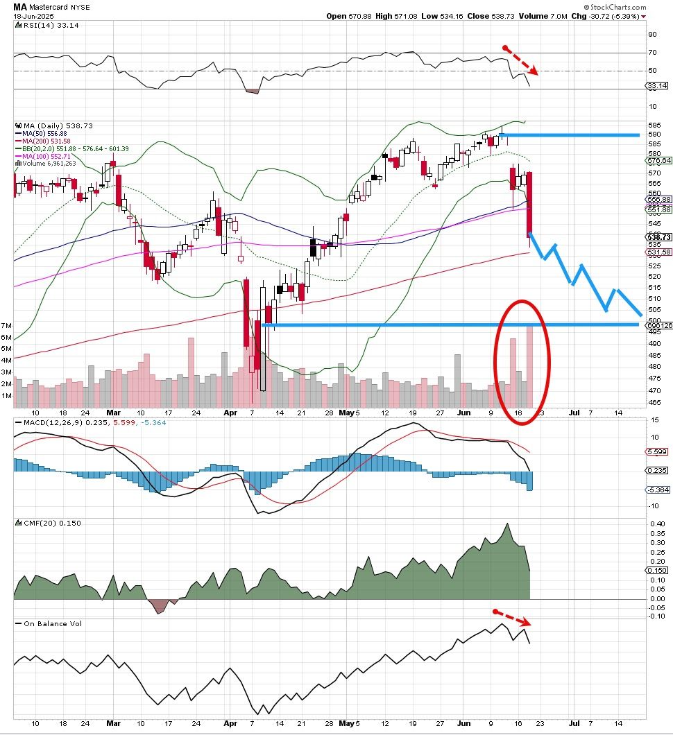 This week saw heavy distribution from Mastercard MA and fellow credit card issuer Visa as these stocks were severely punished. Wednesday was the day and as the chart shows Mastercard effortlessly sliced through support. The MACD is suddenly bearish again, first time since early April. Volume trends are turning bearish as well, with a few days of distribution showing.