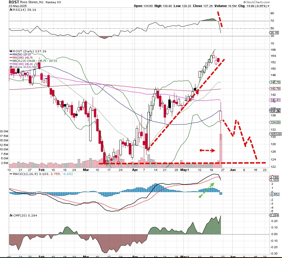 Like Deckers, this retailer warned about their upcoming quarter and attributed the blame towards trade policy and weakening consumer spending. Just very bad here, so let's target that $123 area, and even look for more downside around the $105 if that prior objective is met.