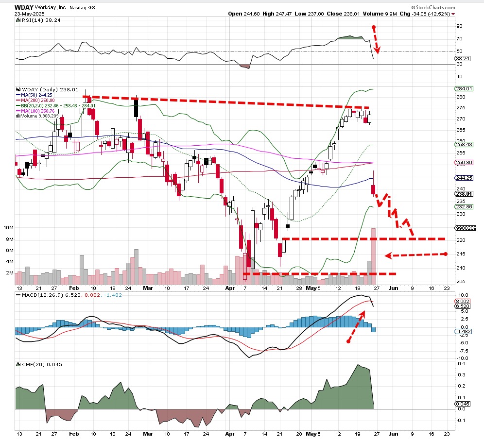 The big software and cloud company Workday WDAY is in need of dire repair after the sellers clipped the bulls' wings. One could argue this is just a modest pullback to the midpoint of a range; that could be right. However, the heavy turnover, negative price action and turn down on the MACD tell us there is more downside ahead. This chart is extremely poor, with RSI turning down and very heavy volume Friday.