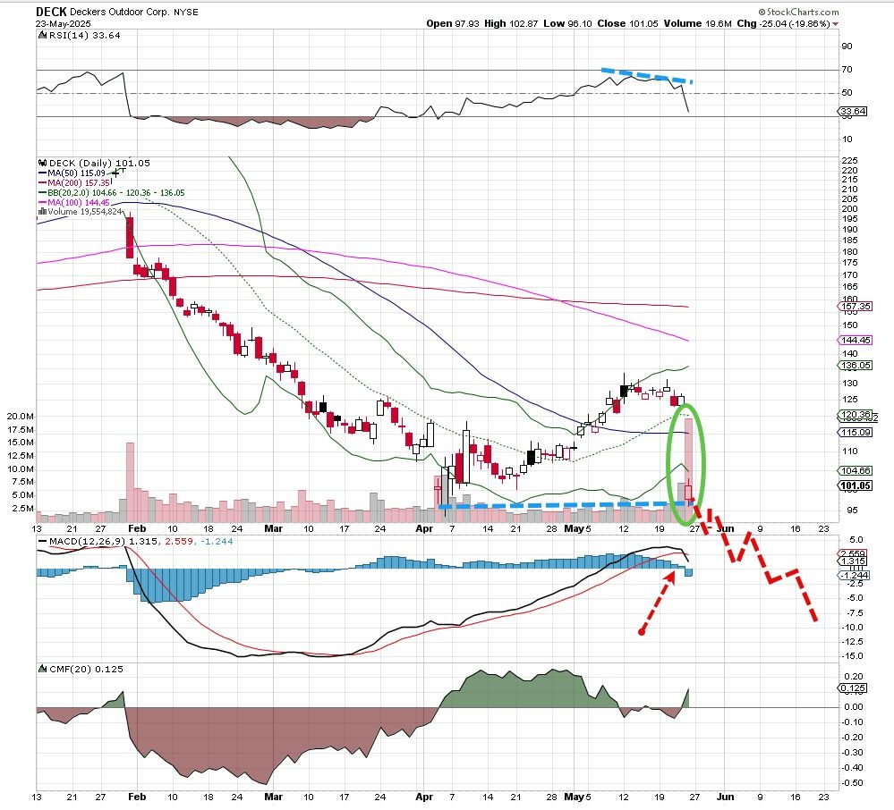 When it rains it pours, as the maker of Ugg boots and Hokas just got pasted this past week following a weak earnings report. Just look at the chart and you can see the stock has been a hot mess for months. Falling about 55% since peaking in early February, Deckers Outdoor DECK has been on the avoid list for weeks.