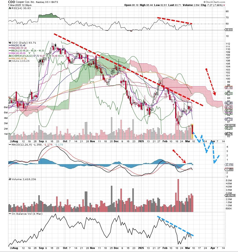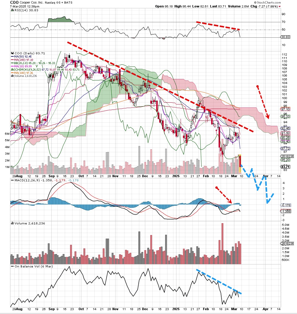 Cooper Companies COO has been in a downtrend for months, with a series of lower highs, lower lows that has crippled the stock. No question the reason this stock has been bearish is due to the weakness in the indicators. There have been high volume moves to the downside with weakness in the MACD, while money flow is bearish.