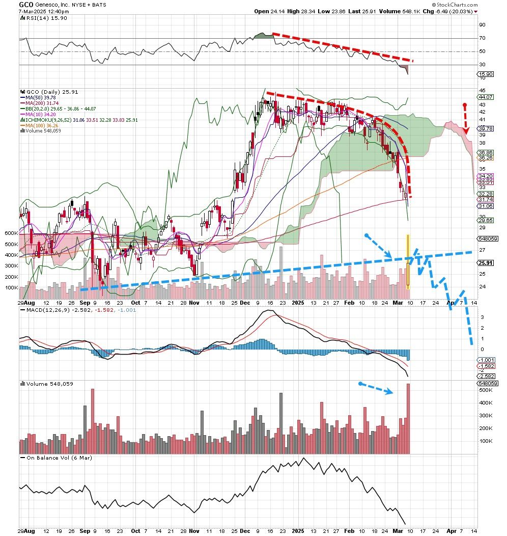 It's remarkable how well charts can predict the action in stocks. Take Genesco GCO, which had shown a bearish trend of lower highs, lower lows but had already reached oversold. Understandably, it would be tough to initiate a short, yet if you did last week you hit jackpot this week with the stock getting drilled into the ground.