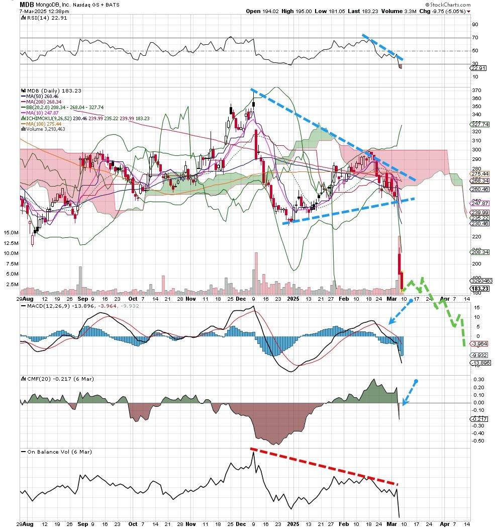 Just an awful day for MongoDB MDB on Thursday with heavy turnover and trading far to the downside. In fact, the stock reached levels not seen in months, and followed through with more bearish action on Friday. That is bad news for the bulls, as the stock is now firmly in bearish territory after breaking the triangle of higher lows and lower highs.