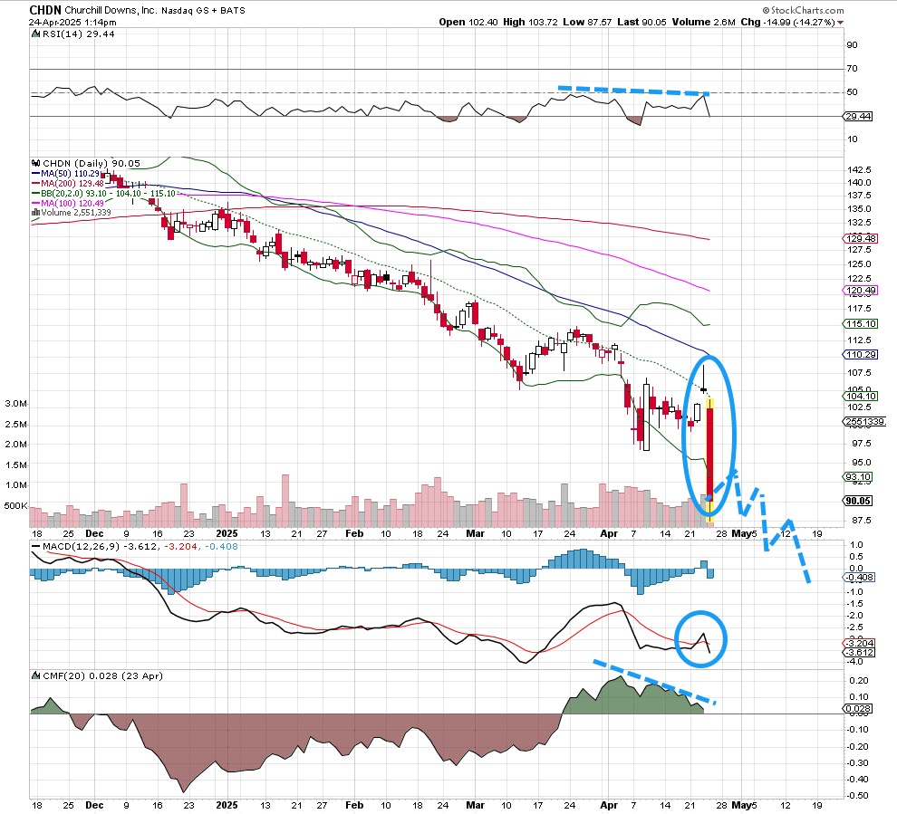 The Kentucky Derby is coming up in about a week and Churchill Downs CHDN is going to be in focus. Yet the sellers have been busy distributing the stock over the past several months, a clear downtrend in place (lower highs, lower lows).