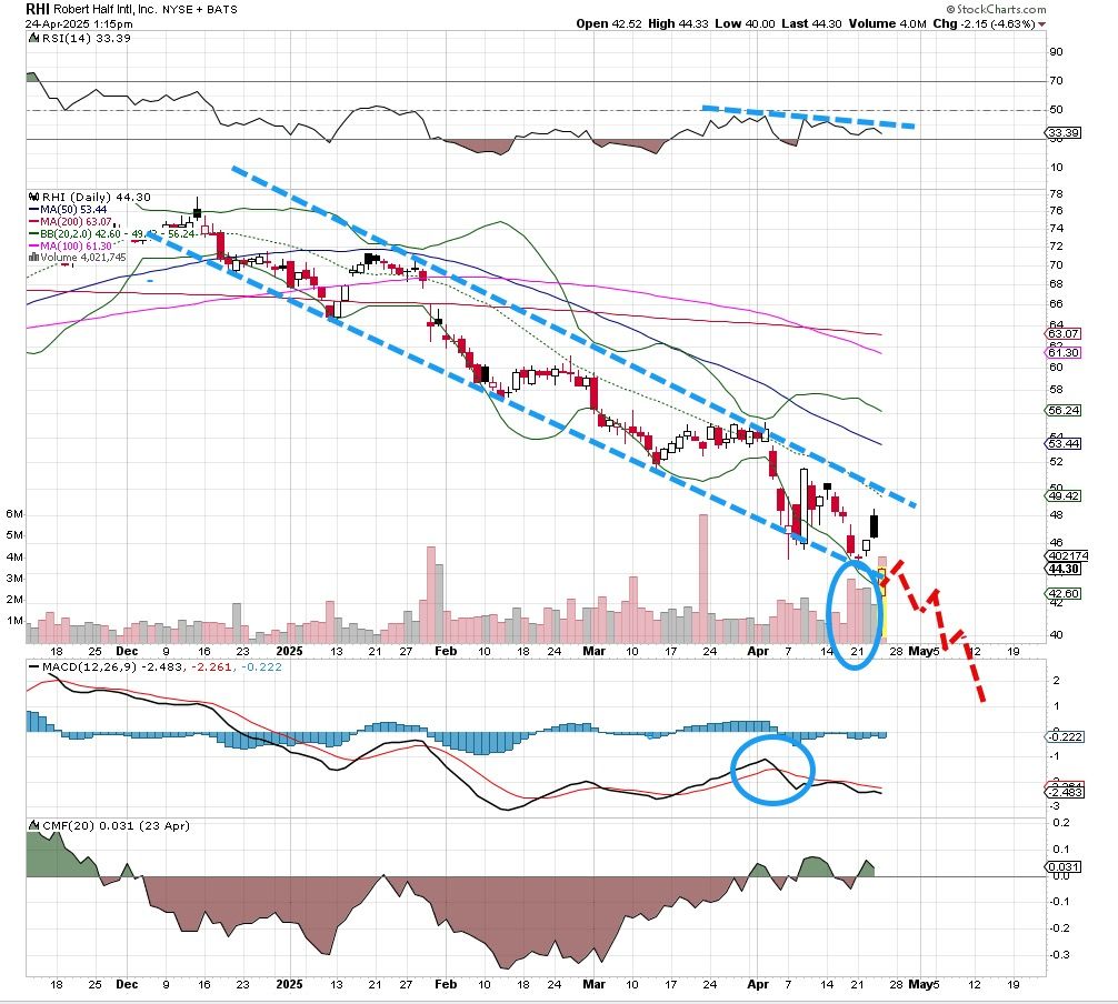 Staffing firm Robert Half RHI is in a tailspin. The stock has been in a deep downtrend since a breakdown late in 2024. With a series of lower highs and lower lows in place there is no question the direction is down.