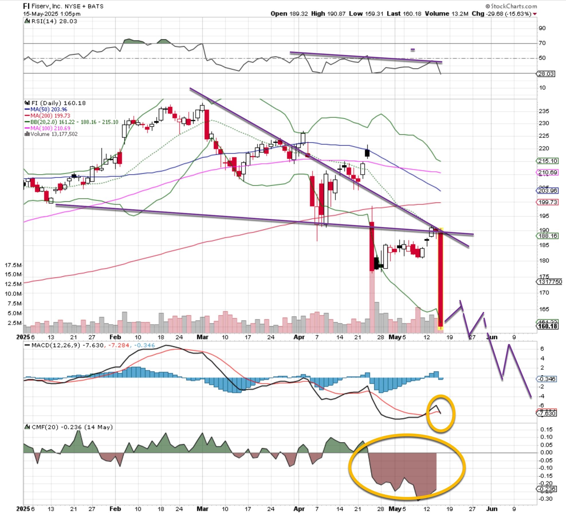 Fiserv FISV has been having a rotten year so far. Since January, the stock has been making lower highs and lower lows, it's that textbook definition of a downtrend. Along with it has been poor volume trends, all bearish all the time. Money flow is deeply in the red right now, and this big bar down on May 15 does not seem to be the end of the slide. We see more coming.