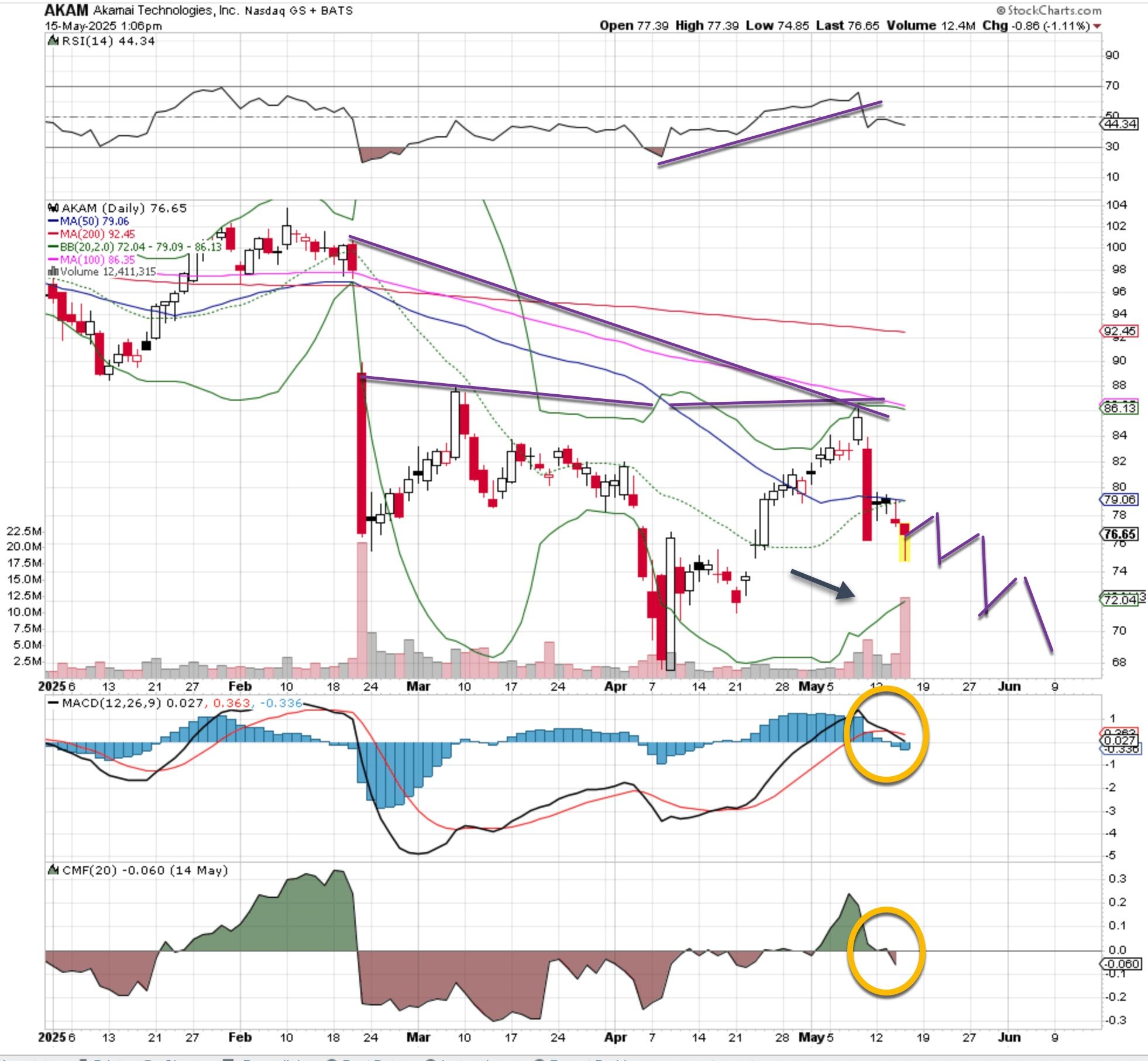 There is potentially some support at the April lows, call it $65 and change. But we don't think that holds here and could see a run into the low 50s before any bulls start to get back on board. Let's target $65 first and then down to those low 50s. It's been a slippery slope for Akamai and that is likely to continue.