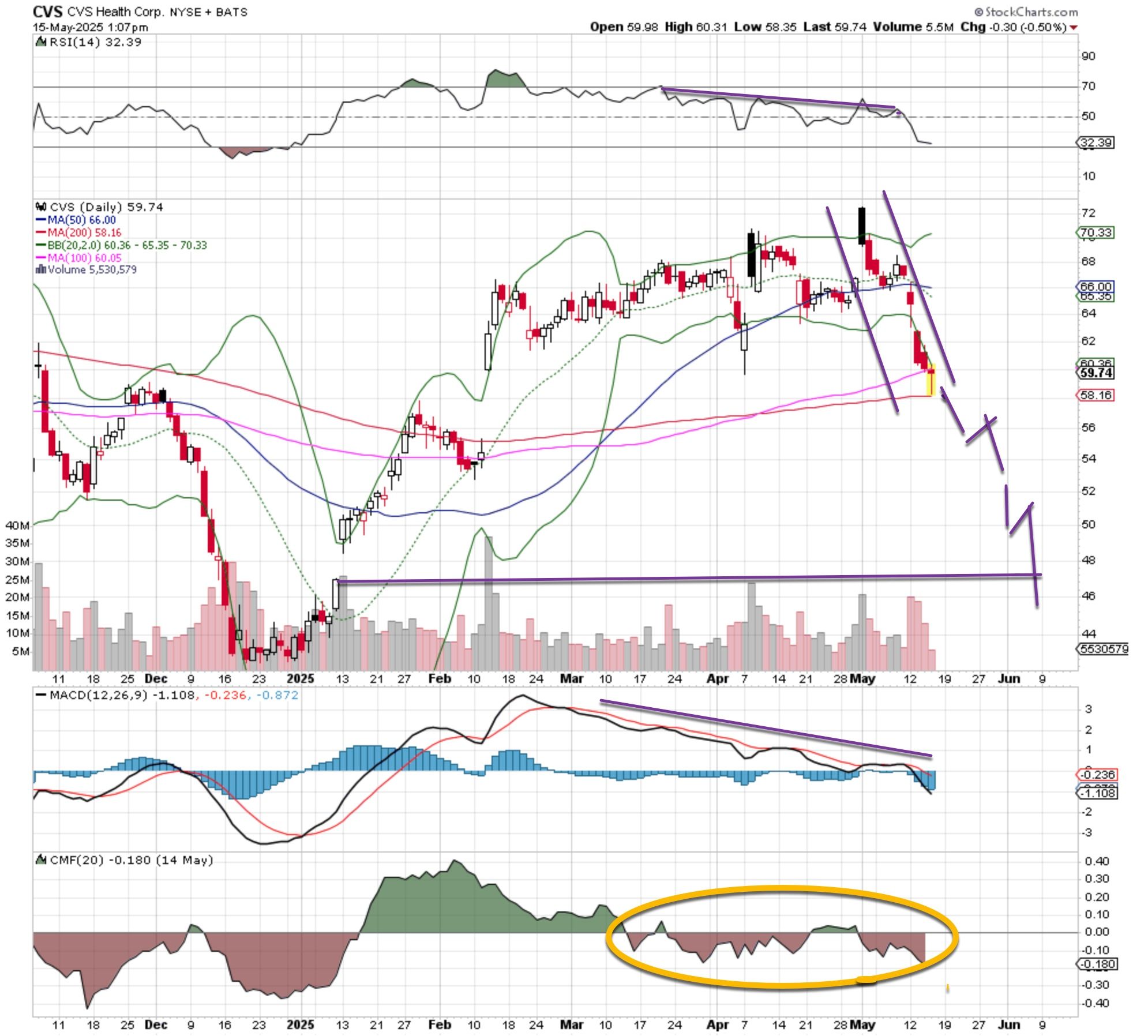 Money flow is poor, relative strength has rolled over and moving average support is being challenged. It means more down for CVS I'm afraid, so let's target those low 40s, put in a stop at $66 just in case.
