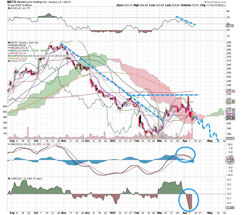 The stock fell sharply at the open and just simply rallied back to its opening level. That is not bullish action and in fact that rally means there is probably some more downside to come for MKTX. Note the weakness in money flow at the bottom, and MACD (moving average convergence/divergence) is confirmed on a sell signal, too.