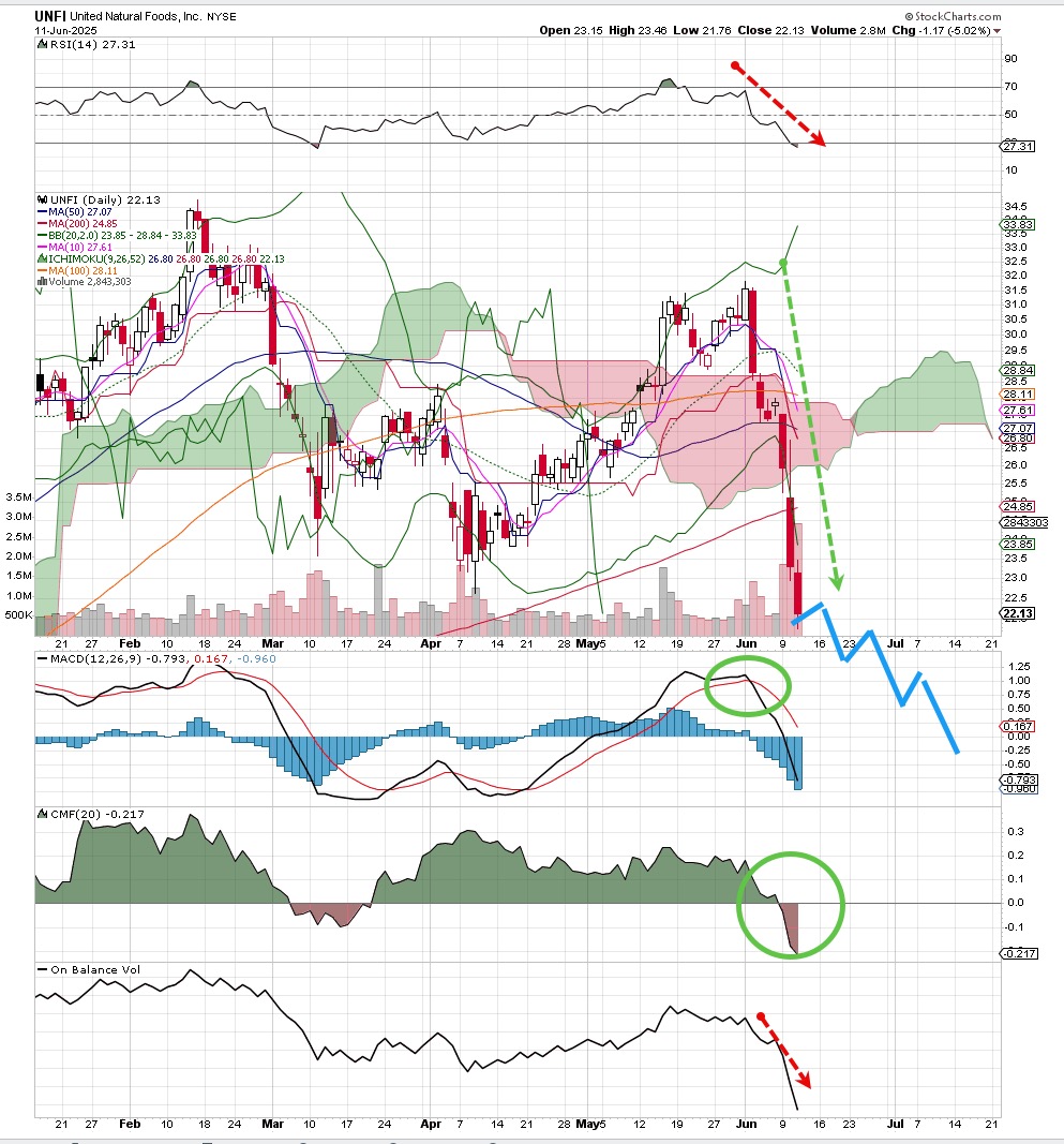 Just a really horrible couple of weeks for United Natural UNFI, with very heavy volume and price action that broke through some heavy support levels. MACD has been on a sell signal for about a month, while money flow is bearish.